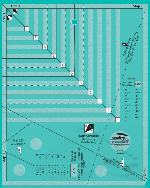 The Kitty Cornered Ruler designed by Deb Heatherly for Creative Grids® will double your fun when making these clever units two at a time in eleven different sizes from squares and rectangles.